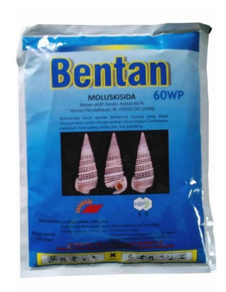 Moluskisida Merk Bentan 60 WP adalah moluskisida racun kontak berbentuk tepung putih yang efektif membasmi keong mas dan siput trisipan, terutama pada budidaya padi sawah dan tambak (udang/ikan). Bahan aktif fentin asetat 60% bekerja cepat dengan dosis 0,5–1 kg/ha (tambak) atau 0,3 kg/ha (sawah), aman bagi tanaman, serta ramah lingkungan.Berat perpack 100gr